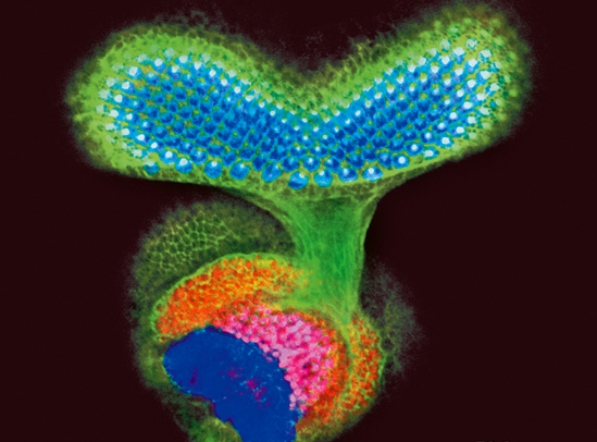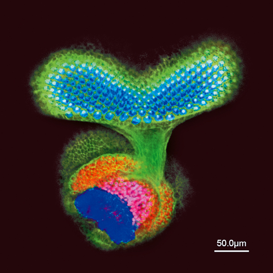 作品有一个非常传神的名字“萌发”,犹如一粒刚刚发芽的种子,蕴含着蓬勃的生命气息,令人感叹生命发育的神奇和伟大。而它的真实取材来自果蝇幼虫的眼盘和大脑。