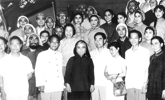 1962年,中国歌剧舞剧院举办演出纪念《讲话》发表20周年,歌剧《白毛女》演出结束后,领导同志与工作人员合影留念(前排左一为舒强)