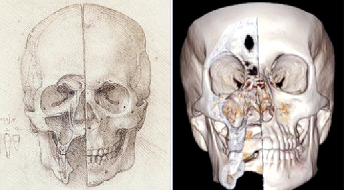 达芬奇手绘的头骨解剖图 数字影像技术扫描的头骨解剖图