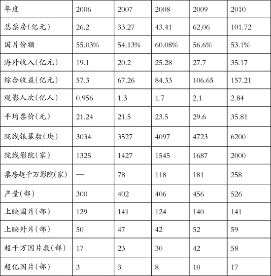 2006-2010年是中国电影发展最快的“十一五”期,这五年是中国电影奠定产业化地位,放映市场全面市场化运作,是电影市场成长最快的五年。回顾中国电影“十一五”期间的迅猛发展,首先得益于城市电影院建设的突飞猛进。当中国电影每年以30%以上增幅成长时,电影产量和市场容量亦不断升级,从而提升了电影在社会的关注度、影响力。继广播、报纸、电视之后电影逐渐成为第四大广告媒体,自此电影广告进入了媒体化时代。