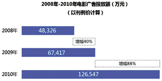 据可统计数据,中国电影媒体广告年营业额从起步时的几百万元,到2007年1.3亿元,2008年近5亿元,2009年6.7亿元,2010年电影映前广告收入同比2009年增加88%,达到12.6亿元,其增长幅度惊人。