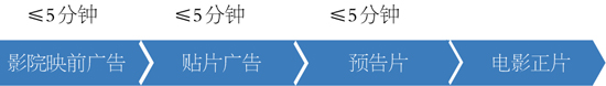 根据2011年底,中国电影发行放映协会与中国电影制片人协会联合颁布的《电影贴片广告、映前广告自律规则》,贴片广告与影院映前广告的时长与次序分布如下: