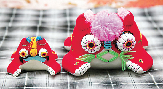 运城杨雅琴制作的布老虎,具有典型的地域特色,老虎身上没有很复杂的绣花,所有的复杂工艺都在老虎面部,眼睛是立体的“南瓜眼”。杨雅琴做布艺已经近30年了,她娘家是刺绣之乡,祖母和母亲都是“巧巧”(擅长刺绣),从小就受熏陶。