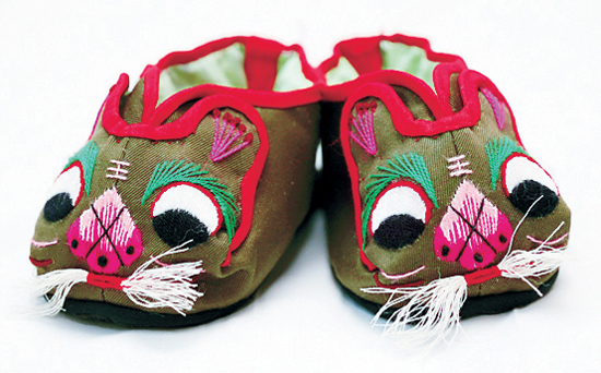 乍见到灵宝的布老虎,就觉得眼前一亮,并不是这个地区的布老虎有多精美或者做工多细腻,而是它有不同于其他产地的最大特点:色彩艳丽的手绘。灵宝地区有深厚民间美术和民俗文化基础。“巧巧”人数多,手艺也多,布艺、剪纸、花馍、纸扎,都能信手拈来。虎形象的表达因此有了各种质地和媒介,单是布艺制品的种类就异常丰富,虎形象出现在帽子上、衣服上、肚兜上、围嘴上、枕头上、鞋子上。窑洞里摆放一只老虎镇宅辟邪,曾经是许多贫苦人家的理想。