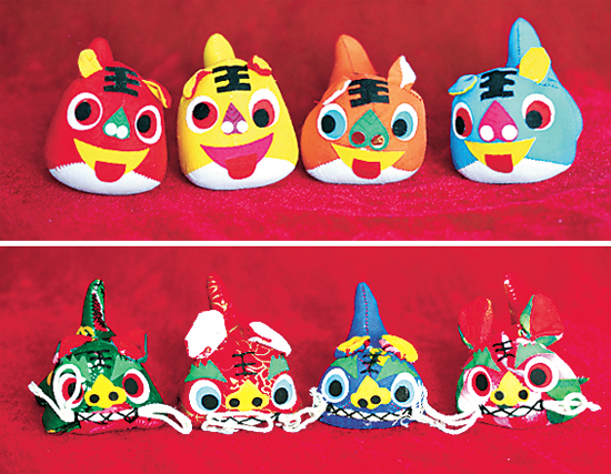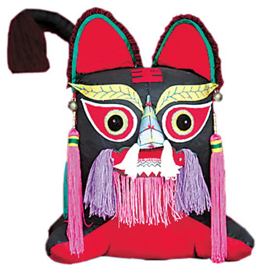 莒南布老虎艺人季桂琴制作的老虎荷包。她的布老虎做工简单,以手绘及粘贴为主,虎身长柳叶眉,吊眼角,大眼睛,品类单一。