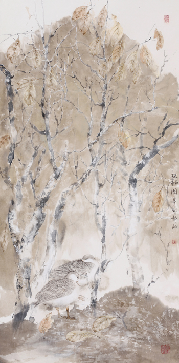 当代花鸟画,特别是工笔与半工写花鸟画,多突出环境描写,如天空、土地、河泊、流云、树木等等。这类强化了环境刻画的花鸟画,与传统的折枝模式有很大不同。折枝模式重视对花鸟自身的刻画,如鸟儿的飞动、跳跃、鸣叫、捕食,花朵的形色、姿致、照应等,背景多留白,即便画环境,也只作局部刻画;突出环境的作品弱化了花鸟本身,强化了对时间与空间境界的营造,不留或少留白底。我们不妨将后者称作“造境模式”。对画家来说,重要的不在选择哪种模式,而在选定模式之后的创造。画折枝者不可胜数,杰出者并不多;画造境者数不清,出色者亦屈指可数!从业者众,出众者总是少数。