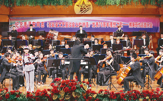 作为老一辈作曲家,傅庚辰具有强烈的社会责任感,与时代同呼吸,与人民共命运,60多年来创作了1000多件音乐作品,体裁多样,风格独特,成就卓越。音乐会在大型声乐套曲《毛泽东之歌》中拉开帷幕,这部大型组曲由《序曲》和毛泽东的《西江月·井冈山》《七律·长征》《十六字令·三首》《忆秦娥·娄山关》《菩萨蛮·大柏地》《沁园春·雪》《七律·人民解放军占领南京》7首诗词组成,诗词的创作时间跨度从1928年到1949年,展现了从开辟井冈山道路到解放战争的胜利,建立新中国,可以说是革命战争年代的历史概括。组曲以独唱、合唱、交响乐等艺术形式,将诗词中的革命浪漫主义情怀演绎得淋漓尽致。序曲由歌唱性的主题开始,贯穿全曲,音乐形象鲜明;《七律·长征》《十六字令·三首》用复调手法加以发展,旋律交替进行,充分展示各声部的对比;《忆秦娥·娄山关》木管引入前奏,意境悠远;《菩萨蛮·大柏地》为女声独唱,民歌风浓郁。新颖的构思和多种技法的运用,使这部组曲的音乐主题突出,又富有变化,深化了诗词的意境,极具艺术感染力。总政歌剧团著名歌唱家秦鲁锋担任了《毛泽东之歌》中3首歌曲的独唱,他的演唱高亢明亮、充满激情。