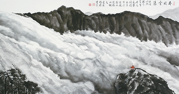 在王林森的山水画艺术中,对于云的关注和倾力表现显现了他的山水画特色,以及他在画云方面的擅长。王林森在处理山水与云的关系方面有着许多独到的想法,因此,他的山水总是云气弥漫,这已成为他绘画作品中一个可识别性特色。云是人们常见的自然现象,本来就具有气象万千、飘浮不定的特性,其吞吐自若、宏阔浩瀚、包容万物的特质,往往比山川、草木更能传递出变化莫测、内涵丰富的大美信息,所以,它是山水画中流动的血脉。其画《云呼山应》,几乎满幅皆云,所表达的正是矢志追求这种大美的强烈意愿。《山因云而弥高》《水因云而愈阔》《画因云而更韵》这三幅组画,更直接将云的价值以一种明白无误的表达方式呈现在人们面前。为了山之高、水之阔,王林森将云的表现提高到常人没有重视到的高度。