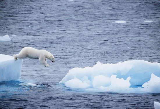 “杀死”这些足以藐视奥运金牌游泳选手的主谋,据一些科学家分析,正是气候变暖所导致的北极冰盖退缩。据称,阿拉斯加海岸的海冰已向北撤退了260公里,这里的北极熊必须游过相当长的一段距离才能找到结实的冰层。漫长的海上寻食之路导致北极熊精疲力竭,很容易被淹死在海里。