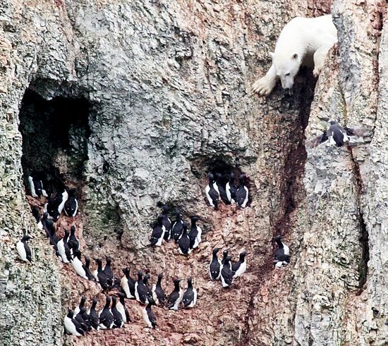 英国《北极》杂志也关注到北极熊目前窘迫的生存状况。它的一篇文章指出,随着夏天北冰洋海冰的融化,在北冰洋斯瓦尔巴特群岛的浮冰越来越少,有的地方甚至消失了。——和浮冰一起消失的还有北极熊的觅食通道。有些学者观察发现,北极熊开始以人类遗留的垃圾、食物、海鸟以及鸟蛋为食。
