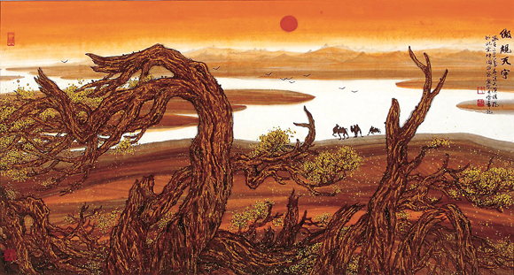 新疆占中国的六分之一,“不到新疆,不知中国之大”。但一部中国山水画史却没有新疆的画卷和记载,令人遗憾不已!由于新疆山水不同于传统山水的特质,也不同于中原江南山水的特质,古人没有画过,现代人画过的也不多。在中国山水画的历史演进中,在传统技法和理论体系方面都没有现成的范本可供借鉴,更没有前人的路可走。作为置身新疆西域大漠的山水画家,我们有责任和使命开创新疆山水画新的表现形式,在新疆独特的地域特征和丰富深厚的民族文化基础上,吸收、借鉴古今中外一切优秀艺术文明成果,探索发现并创造新的笔墨程式和艺术语言,“融合古今,折衷中西,继往开来”,则是我们明智的选择和目标。