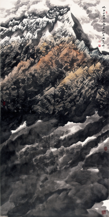 高原系列中运用嶙峋怪石似的写意和层层积染的积墨笔法,使得这种占领显得更为简洁和犀利,省去了所有枝蔓和过程,直捣黄龙。中国画是一个感性认知过程的表现,所要刻画的不是物理客体,而是内心的认知,“因心造境,以手运心”。比之西方绘画,中国画更多强调的是心的感悟,而非手的绘画制作技巧。“知画之为物,是性灵者也,思想者也,活动者也,非器械者也,非单纯者也”。用自矜的话来说,中国画需要更多的自我修养和更多的文化,所以“文人画”便成了中国绘画的一种标高和标志,成了艺术与匠人之间的分野,正如张彦远《历代名画记》所云:“自古善画者,莫非衣冠贵胄,逸士高人,非闾阎之所能为也。”写意技法便是文人画思想的物质手段,是感性认知的技术表现。作为一介“文人”的张文华,在高原的几年游荡中,他带着从学院中练就的写实基本功,在离天最近的地方,感受和体悟着高原的凄寂与悲壮,寻找着最贴切的语言表达形式,思考着艺术本体中的许多问题,此时,只需心在高处。所以高原系列要传递的并非高原美景,而是对这种景致真切感受。山峰如戟,天空如染,草原如涌,这种快捷和酣畅的笔法的确给人以强烈的视觉冲击,这不仅可以更为真切地表现青藏高原荒野苍茫的粗砺质感,而且也更能契合中国画中“不下堂筵,坐穷泉壑”的意趣和境界,诚所谓“画者不过意笔草草……写胸中逸气耳。”