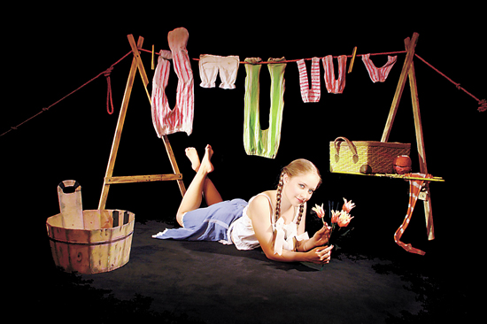 夏日的午后,一个小女孩像往常一样洗着自己的小衣服,洗好后她把衣服晾在晾衣绳上,拿起毛线织起长袜子来。不一会儿,她心爱的男孩在远处喊她,小女孩便追了过去。就在这一刻,黑色的舞台中神奇的一幕发生了,晾衣绳上五颜六色的衣服们仿佛被施了魔法,自己飞了起来。红蓝荧光色条纹相间的两条裤子用力地舒展了一下自己的身体,隔着中间的另一条裤子竟然展开了决斗。毛衣针们变成了宝剑,毛线团则分成两半变成小圆盾牌,胜利的一方更向台下的观众表示感谢。小女孩回来后,发现衣服全都不见了,她伤心地哭了起来,裤子们见状赶紧接二连三地乖乖回到了晾衣绳上。