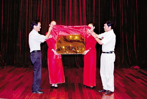文化部原副部长潘震宙、文化部华夏文化遗产保护中心主任乔申乾为华夏文化遗产中国画院成立揭牌。孟祥宁 王俊峰/摄
