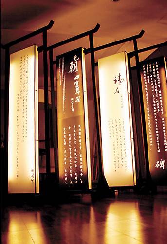 1912年,法国作家维克多·谢阁兰在北京出版了他的诗集《碑》,诗集木制封面以及书中每首诗的右上角皆配有汉语题词。在诗集出版百年之际,由北京法国文化中心、中国国家图书馆、中央美术学院主办的“谢阁兰《碑》1912-2012”展览8月29日至10月15日在北京举办。该展览精选了《碑》中12首诗歌作品,并按照谢阁兰原著风格配以书法题词。展览共包含20块展板,其中有7块为中式卷轴书法作品。展板形式与尺寸的选择重现“碑”的形态,而最能表达“碑”神韵的便是传统样式的书法。展览所选诗歌为中法双语,其中旅法艺术家诗蓝的装置作品《碑》非常引人注目,她带来81块“碑”,“81”是北京天坛圜丘上层最外环石板的数量,也是谢阁兰的《碑》1912年首版的印刷量。