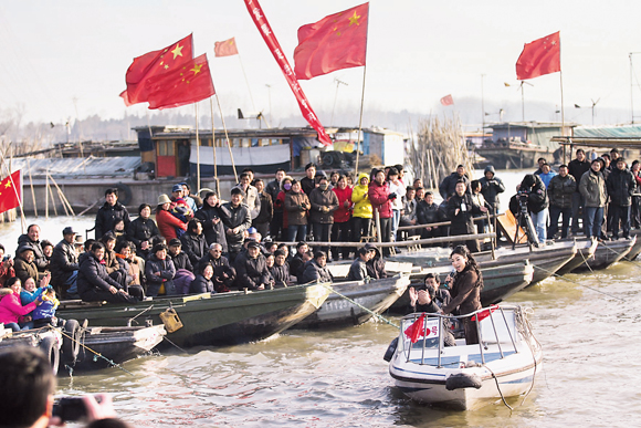 2008年2月,文艺工作者在江苏淮安水乡慰问,歌唱演员在小船上为群众演唱 王 雨 摄