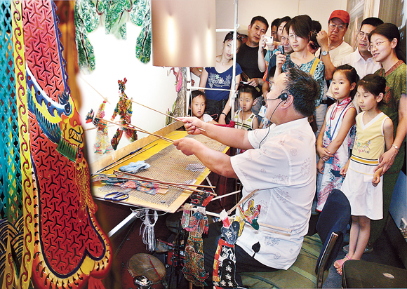 2009年7月,民间艺术家在社区表演皮影 张玉英 摄