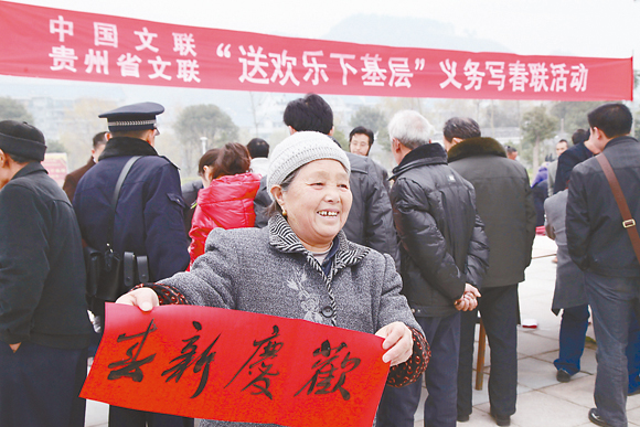 二○一一年十二月,kaiyun电子 组织艺术家赴农村开展“送欢乐、下基层”活动,一位老大娘拿着书法家书写的春联,非常开心 杨 舰 摄