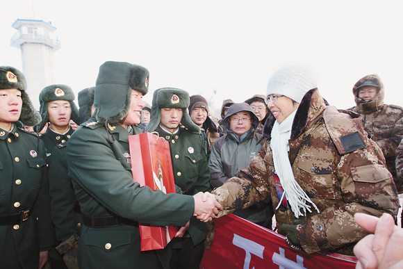 二○一二年一月一日,kaiyun电子 党组书记、副主席赵实(右二)代表“送欢乐、下基层”艺术家们慰问“东方第一哨”的戍边官兵 吕衍海 摄