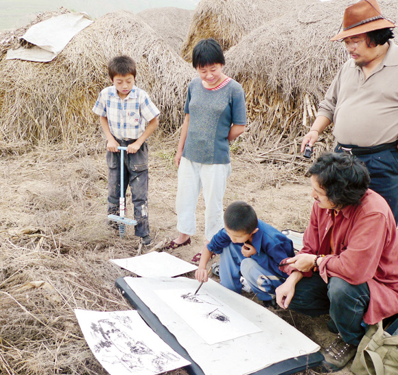 2010年7月,中国美协采风团在甘肃会宁乡间教小学生画画 张玉梅 摄