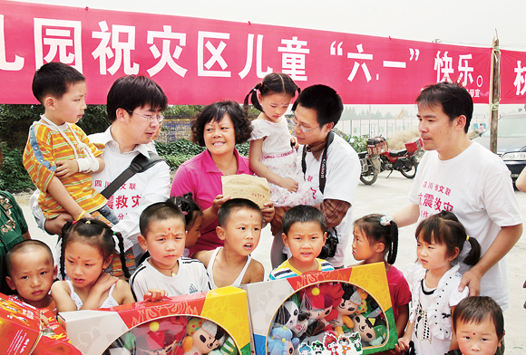 2008年6月,《中国艺术报》采访小分队与都江堰“爱心亲子战地幼儿园”的孩子们一起过儿童节 陈 军 摄