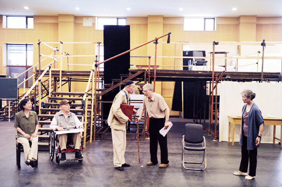 经过两个月的紧张排练,北京人艺年度原创大戏《甲子园》于8月28日对媒体开放探班。该剧因云集了北京人艺老艺术家蓝天野、郑榕、朱旭、朱琳、吕中、徐秀林和中青年演员王姬等备受关注,在开票第一天就创下了296万元的票房成绩。9月15日,《甲子园》将登陆首都剧场。“有了老艺术家们,我们心里就有底。”导演任鸣坦言。几个月来,年龄跨度达一个甲子的几代演员之间,除了默契,更培养出了一种戏里戏外的亲情。而观看老艺术家们排练,也成了年轻演员们难得的学习机会。