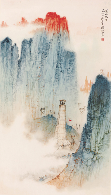钱松喦的笔墨显得要规整、细致些。从20世纪60年代描绘山河新貌时,就已用波磔起伏的笔线表现层层的山石、遒劲的枝干,房屋田野、舟桥公路以及吊车、铁塔、电线杆诸多景物皆融入自己的笔意里,可以说西方的透视法为山水画提供了审视空间的新角度,让空间表现贴近视觉真实。对此,山水画家一方面表现出适当采纳的态度:“画小品可以交代透视,透视对你有帮助,何必放弃”;“能表现画面深度和层次的那些斜的透视线一定抓住不放,它能使画面深远过去,纵深线是构图的生命线”;“山水画家懂一点透视学,我认为也是需要的,山水画中屋宇楼阁与建筑物的处理,适当地运用透视学的画法”。另一方面表现出恰当疏离的态度:“画不是透视的说明,看得过去就行了,不要过死地要求透视”;“表现大的场面,画千岩万壑,便不要被透视局限住”;“如果用几何透视学的原理去解决一棵树的透视变化,那可能是极其复杂的”;“山水画的‘咫尺千里’也不是单纯靠几何透视规律所能解决的”。