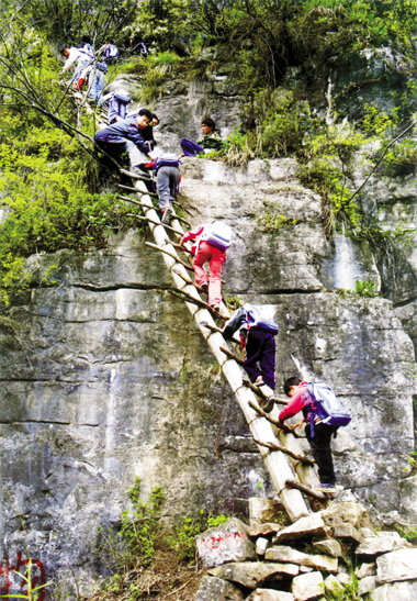 在海拔2800多米的五道天梯和90多处拐弯与绝壁相连的陡峭山路上,李桂林、陆建芬夫妇通过背、拉、扶等多种方式,接送孩子们上学和回家。 袁孝正 摄