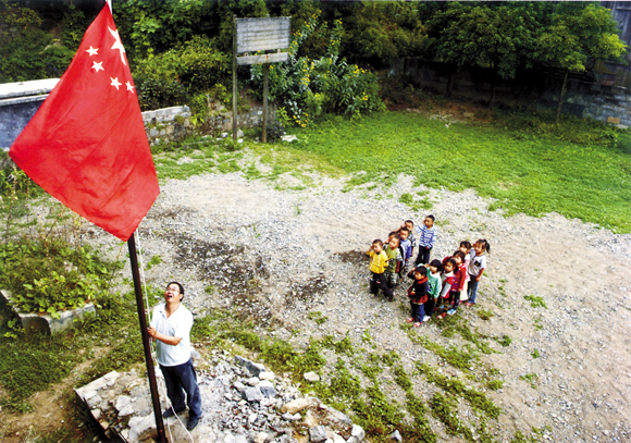 湖北恩施咸丰县丁寨乡天上坪教学点,刘永刚26年来坚守在教学一线,每周一他都会和学生们一起举行升旗仪式。 王艳 摄