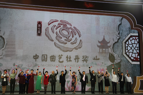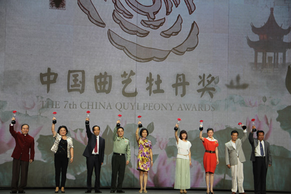 第七届中国曲艺牡丹奖表演奖和理论奖的获得者上台领奖