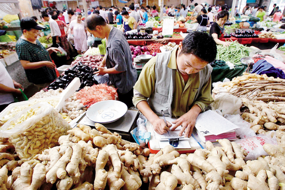 8月27日,“生姜叔”姚启中在自己的菜摊上抓紧片刻功夫“码字”。