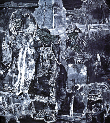 李连志在水墨画《天堂》系列中追求超越现实,追忆远古之中找到自身艺术发展的潜能,他解构生活,解构传统笔墨,解构青藏文化,去寻找建构属于自己心灵的时空关系。《天堂》系列在黑沉沉的墨色基调中,可以见出洒脱的运笔的凝重与沉着,笔痕、墨迹、意绪、情思,创造了属于李连志的视觉笔墨符号。《天堂》系列的心象话语与我们沟通,欲说不止,欲罢不能。所以,我们在《天堂》系列中,看到的那种充溢于笔触和墨层中的精神,是由笔墨直接表达出来的。其实,绘画的审美精神涵义往往不是通过理解的方式,而是在“品味”的过程中通过视知觉方式去把握的。其过程不免抽象,但它本身却能够相当确定地通过艺术的视觉形式输入、储存和输出某一时代或某一位画家的特定精神信息。这些信息的传达是靠其表层的主题内容,正如现代人在敦煌莫高窟或永乐宫所受的感染和震撼,并不一定依靠宗教的教义,而是来自壁画“美”的永恒魅力。简而言之,以社会性内容为艺术的精神,主题内容是实质的,形式美感是外在的;另外,以审美涵义为艺术精神,社会性内容是其表层含义,只有美才是深层次的,更本质的。若用真、善、美的原则来衡量,把艺术精神等同于社会实用功利目的,其实质属于“善”的范畴;应将艺术精神纳入“美”的范畴,美毕竟是艺术存在的本义,美可以与善结合,却不被善取代。我认为这是艺术本体论的深化,是从善向美的回归。李连志正是循着这个方向逐渐深化的,从《天堂》系列创作来看,他极力高扬的主题与墨象的图式都归于一种社会意念的驱动,他的艺术精神等同于这种社会性意念,而作品的审美形态则是围绕这种意念而展开的。
