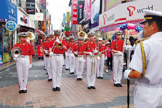 中韩两国青少年在韩国光州市步行街巡游联欢