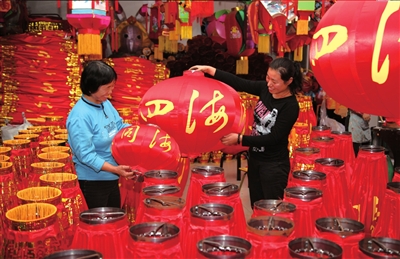 9月18日,怀柔区九渡河镇红庙村村民任新荣(右)正在工作间为订户赶制红灯笼。 图/东方IC