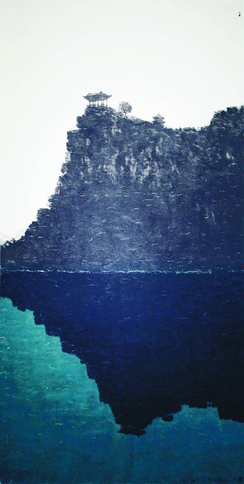 山为德、水为性的内在修为意识,使杜大恺爱画山、爱画水,但他不是传统意义上的山水画家。中国历朝历代绘画中的山水表现程式异常丰富,或勾、或皴、或点、或染,气象万千,杜大恺也是用这些技法,可是出来的画面完全不同。他的山多以块面形式呈现,或山势延绵或仅取一隅,多是视觉所及,不是传统山水想象的高大全,却更显耸立巍峨,如《与山相喁》《我或识云山》《一山独峙天地间》等。他画水少有激流险滩波涛汹涌,多是深泓幽静倒影曈曈,如《为有碧水林影稀》《影垂屋前为凝碧》《潭深影亦深》等。他曾有几件“影垂水乡”的作品是专画水中倒影的,波光影滟亦真亦幻,自然传统中无处寻觅。“山水”是杜大恺水墨画创作的一大主题。他喜欢阐释山的崇高、伟岸、壮丽和永恒,常以水来映衬山的宁静。江南水乡也是他创作的重要素材,他曾多次前往周庄、查济、乌镇等地写生,带回一批水墨写生佳作,更创作出《三月徽州最当时》《此情可待成追忆》《山乡雨后云有无》等作品。