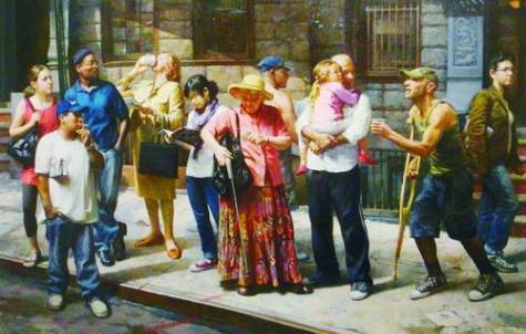 而最震撼我的,还是马克斯·金斯伯格的三幅油画:《公共汽车站》《皮耶塔战争》《无法赎回》,都是人物群像画,只是将特定场景放入一种复杂的社会大背景里,融入更多的现实苦难和个人的慈悲感,通过群体人物的姿势、动作和表情,表现画家的时代责任感和人文关怀。《公共汽车站》,有看书的姑娘,有抽烟的男人,有抱着小孩的老汉,也有以不同姿势站在那里等车的人,一位拄着拐杖的乞丐老汉,走过来伸手乞讨,一位戴着草帽的老妇人从包里掏钱(给乞丐),更多的人只是无关自己地望着……这是今天社会最普通的一种场景,但它充满着人性的关怀,充满了画家冷静的慈悲感。《皮耶塔战争》,一个女人双手抱扶着躺在地上的男人的头,仰天嚎啕大哭——那男人是她的丈夫,头上裹着渗血的纱巾,躺在地上,一只腿、一只手都已被炸掉……而他们的背后却是战争滚滚的硝烟——画家在呼唤和平,呼唤人道。还有好像是再现美国9·11事件现场目睹者表情的《无法赎回》,重现一种悲伤的记忆,唤醒人们对生命的珍惜,对大爱的追求及对惨无人道之恶行的谴责。