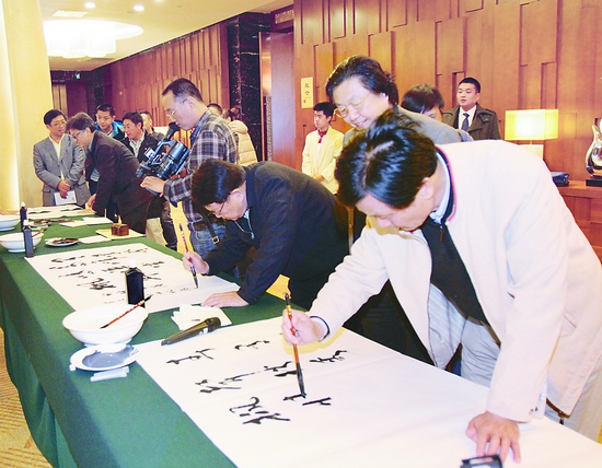 在书画笔会上,作家兼书画家们纷纷以书法的形式写出自己赞美本溪枫叶的诗文,为此次公益文化行助力。
