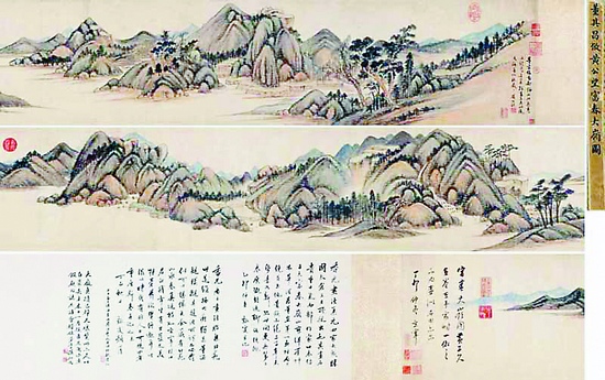 本次秋拍古代书画部分将有董其昌的《仿黄公望富春大岭图》首次亮相,清代宫廷画家张宗苍的《云栖山寺》亦将首次在拍场露脸。《仿黄公望富春大岭图》为董其昌晚年精心之作,纵28.5厘米,横297厘米,纸本设色,入清后曾为内府所藏,被著录于《石渠宝笈·三编》,晚清时流出宫外,辗转于王孝禹、吴普心、颜世清、周叔廉之手,因为藏弆得所,故保存极为完美。从多角度看,此卷无疑是董其昌晚年作品中画风典型极为精彩的一件,其艺术价值自不待言。《云栖山寺》手卷是进士及第、常伴君侧的词臣画家张宗苍奉命为宫廷装饰而作的大幅纪实山水。此卷经《石渠宝笈·续编》著录,至清末始流出宫外,保存上佳,是张宗苍画中难得的精品,目前估价待询。