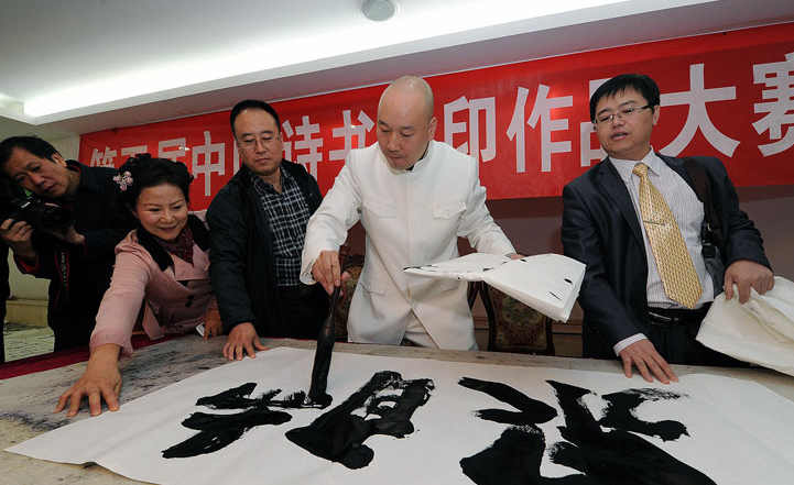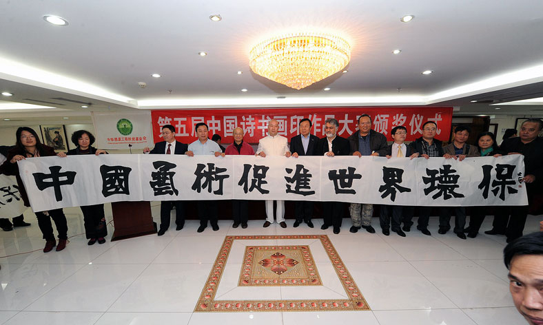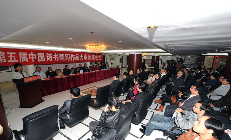 由中华思源工程扶贫基金会、中国书画艺术产业联盟、中国名家书画研究院、中国华夏画院、北京金台艺术馆等单位联合主办的第五届中国诗书画印作品大赛颁奖仪式在北京吴东魁艺术馆隆重举行,国内百余位书画艺术家齐聚一堂。本次大赛自2011年10月22日启动并面向全国征集作品后,得到全国各地书画艺术家的大力支持与积极参与,最终74件书法、绘画、诗歌作品从全国3000多幅参赛艺术作品中脱颖而出,最终评定出金、银、铜等奖项。中华思源工程扶贫基金会“爱的分贝”聋儿救助项目作为本次大赛承办方之一参与此次盛会。
