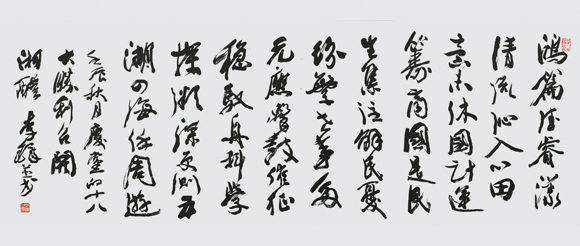 释文:鸿篇德睿漾清流,沁入心田意未休。国计运筹商国是,民生集注解民忧。纷繁世事多元应,击鼓催征稳驭舟。科学探微深更测,五湖四海任周游。——壬辰秋月,庆党的十八大胜利召开!湘醴李铎并书。 (汪碧刚)