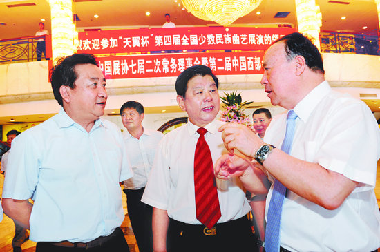 2010年7月15日,在贵州省举办的第四届全国少数民族展演活动闭幕式前,白立忱与胡振民、姜昆亲切交谈