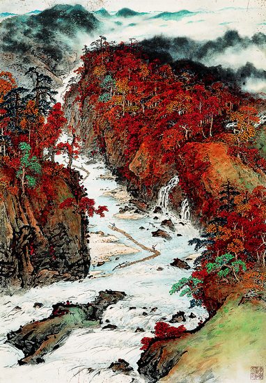 他于1983年取材于日本鬼怒江的作品《秋溪放筏》即是明证。在鬼怒江,他正好遇见枫树红叶。看到这样的场景,他便思考如何用中国画表现色彩浓烈的景色——以重彩的形式层层上色叠加,是他的创作方式。这幅作品是他在创作风格上的一次重要转变,也是他作品中具有色彩张力和探索意义的名作。