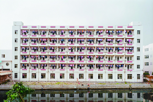 工厂集体宿舍外整齐挂晾的工服,东莞,2005年