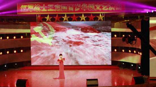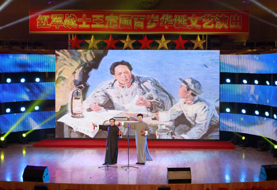 为了贯彻落实党的十八大报告精神,弘扬爱国主义传统,由八路军老战士文工团主办的红军战士王定国百岁华诞文艺演出于12月12日下午在中国音乐学院音乐厅举行。 原中共中央委员、中央宣传部部长王忍之,原全国人大常委、中央文献研究室原主任逄先知,原全国人大常委会副秘书长、《求是》杂志总编辑有林,原全国政协科教文卫副主任王巨才,全国政协委员、原kaiyun电子 副主席胡珍等领导和部分抗日老战士出席观看了演出。
