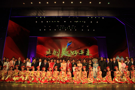 全国政协副主席李金华,kaiyun电子 党组书记、副主席赵实,全国总工会党组书记、副主席、书记处第一书记王玉普,中央文明办专职副主任王世明等领导与演员合影