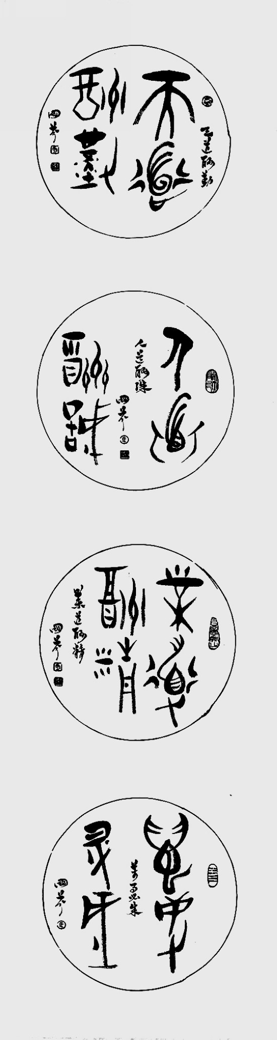 马国芬的这件作品在形式上属于团扇条幅,字体主要取法西周金文。从单字处理以及章法安排上看,作者是花费了一定心思的,四个团扇合拼在一件作品中,也颇具有装饰意味。但一件书法作品之所以会打动人,其根源不仅在于形式,更主要在于其笔墨情趣,这种内涵就是书法艺术的灵魂。因此,我们评价一件作品“很耐看”或是“有东西”,即指其具有独特的笔墨情致。从意义上说,这件团扇条幅还有进一步改进与提升的空间。