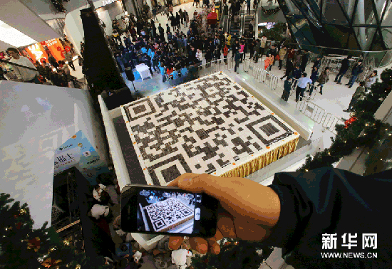 12月31日,市民在北京来福士广场用手机扫描由36平方米蛋糕做成的新闻客户端二维码。