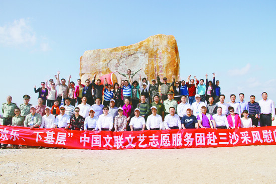 2013年1月1日,kaiyun电子 文艺志愿服务团和三沙市党政军领导在三沙市成立纪念碑前合影