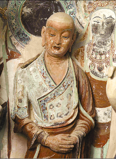 彩塑的选择也颇有讲究:莫高窟第17窟是晚唐僧人领袖洪辩的纪念窟,其中的洪辩像,是目前已知最早的优秀人物肖像彩塑留存;莫高窟第194窟中的菩萨,衣饰色彩清淡,纹样繁华,有织锦刺绣的质感,是塑绘结合的典范。