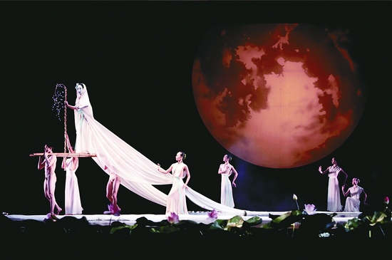 《九歌》中李名觉从林怀民强调的楚地水泽繁花的意象出发,在视觉上大量运用了荷花的元素。他引用台湾前辈画家林玉山在1930年创作的画作《莲池》,一手打造了巨幅荷花绘景,创造出荷叶荷花满天的景象。而剧院的乐池也被别出心裁地注入了真的池水,化为水汪汪的池塘,田田荷叶托出粉色荷花,始终在舞者与观众之间摇曳生姿。